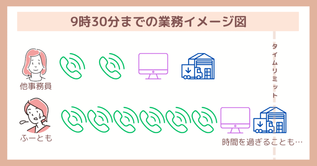 会社は某製品の卸会社でした。始業直後の8時30分から注文の電話が鳴り続け、営業の人たちは朝9時30分にルート配送に出発する日常。電話で受注、受注後はすぐにPCで伝票を発行し、倉庫へ持って行く。倉庫担当者が商品を準備し、営業が出発時に追加で持ち出せるようにする。これを朝9時30分まで、事務員全員で行います。