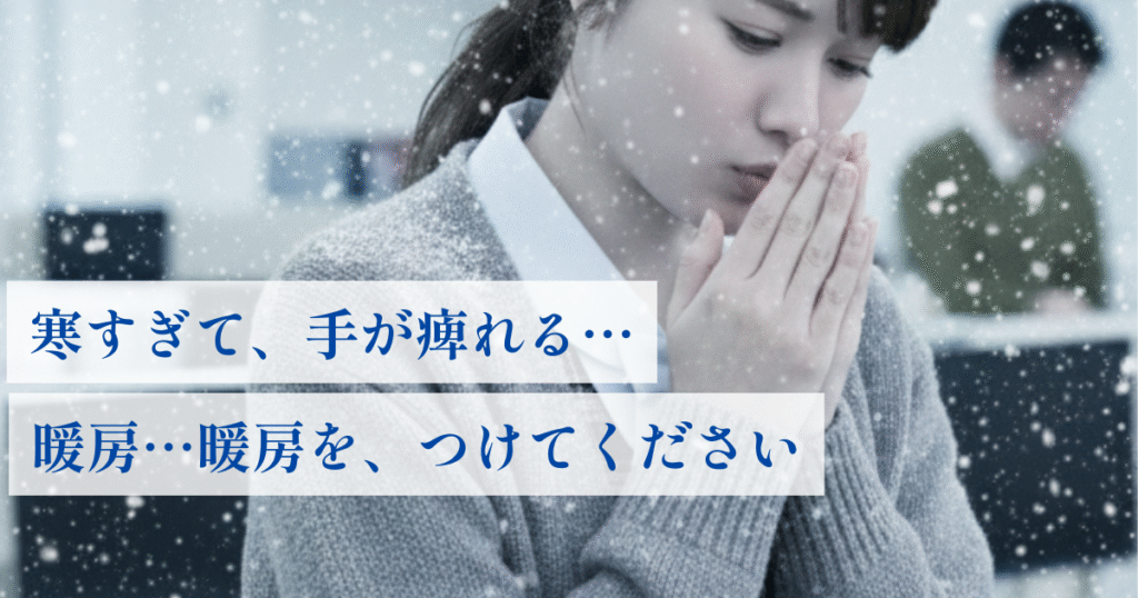 1月なのに…真冬なのに、暖房器具が動いていない…。ストーブや暖房は視界に入っていますが、動いていないのです。絶対にまともな返答がもらえないことは百も承知の上で、「暖房やストーブは使わないんですか?」と尋ねたところ、「会社の方針で、節約のために日頃は使わないんです。あ、来客がある時は使いますよ!」と自信たっぷりの返答。
