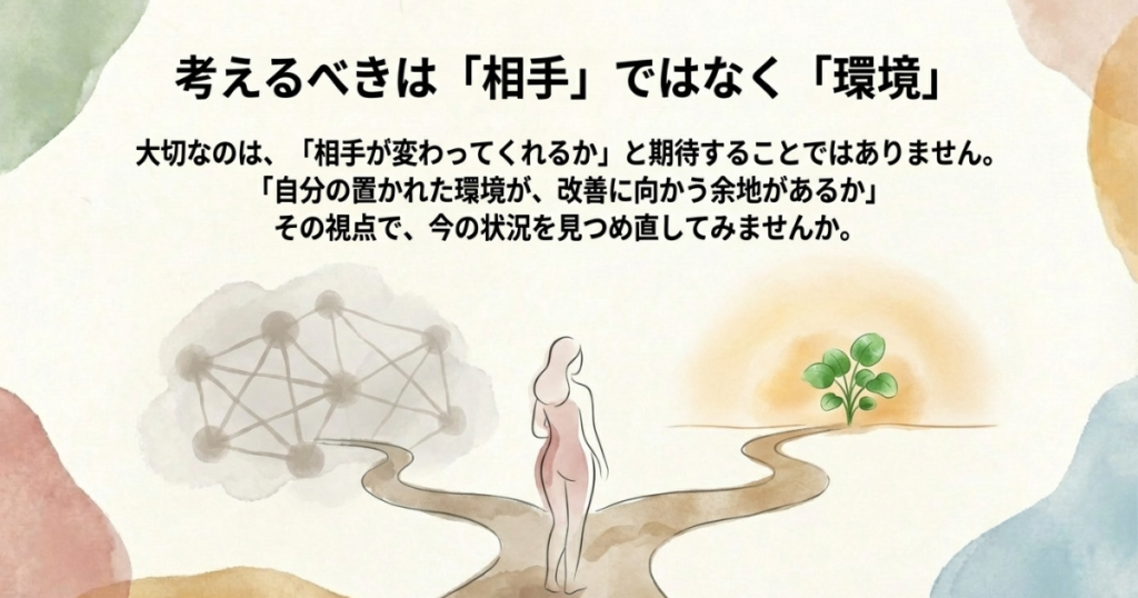 大切なのは、「相手が変わってくれるか」ではなく、「自分の置かれた環境が改善に向かう余地があるか」という視点で考えること。人間関係を何とかしようと真面目に向き合う人ほど、「辞める」「距離を取る」といった判断を後回しにしがちです。ですが、「改善しない」と見極めることも、立派な選択のひとつです。