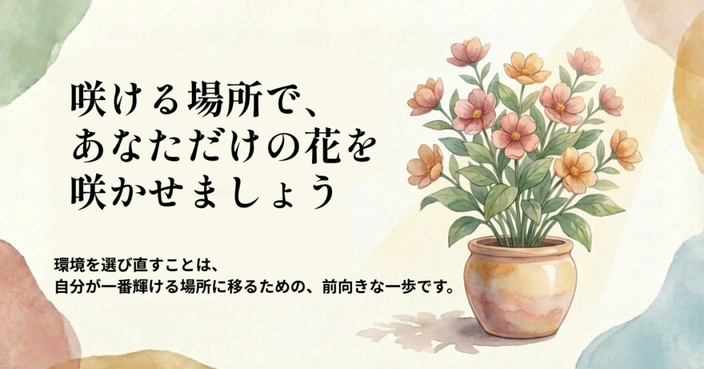自分に問い直したときに出てきた答えを、大切にしてください。環境を選び直すことは、逃げではありません。それは、自分が咲ける場所に移るための手段です。咲けない場所で努力し続けるより、咲ける場所で、あなただけの花を咲かせましょう。