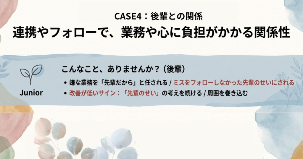 「改善の可能性が低い」に当てはまる場合、後輩個人の問題というより、関係性や環境そのものに課題がある可能性があります。今後もこの環境で働き続けるかを考える際の、判断材料として捉えることが大切です。
