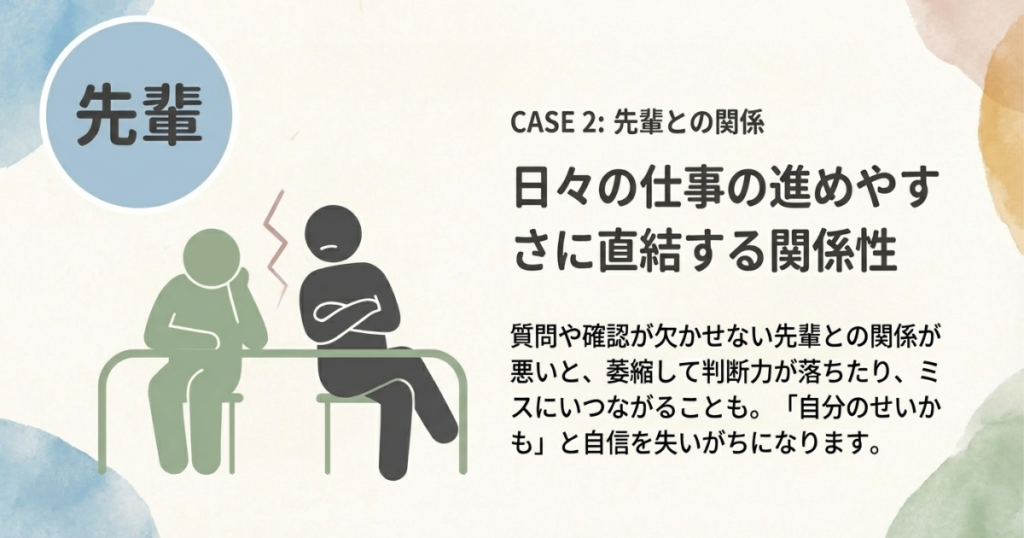 同じ業務を担当する先輩との関係は、日々の仕事の進めやすさに直結します。特に、質問や確認が欠かせない立場にある先輩ほど、態度や言動の積み重ねが負担になりやすいのが特徴です。