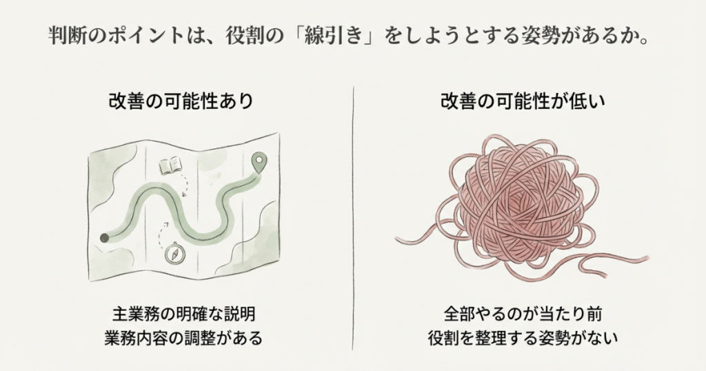 業務内容が想定とずれている場合、改善が見込めるかどうかは、業務内容を線引きしようとする姿勢が職場側にあるかで判断できます。