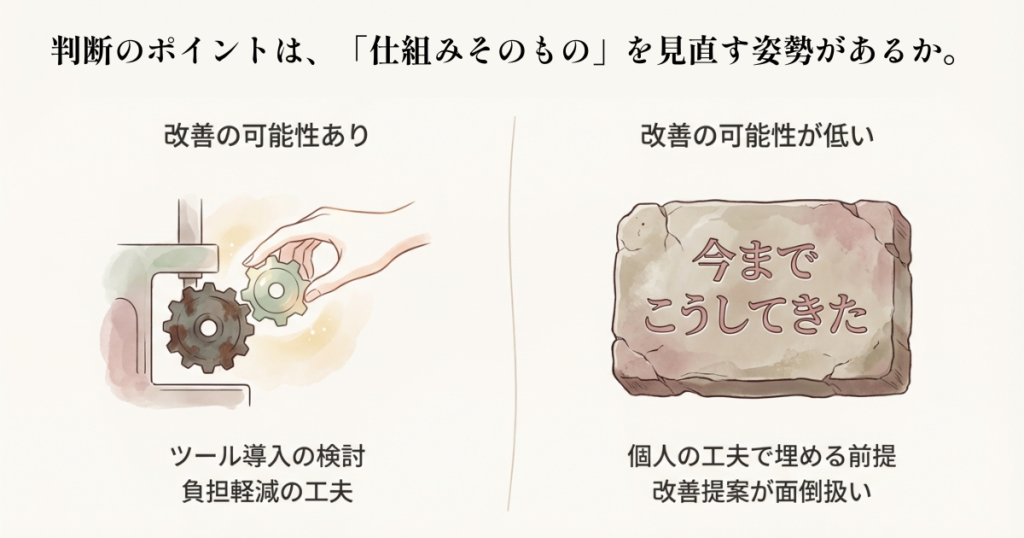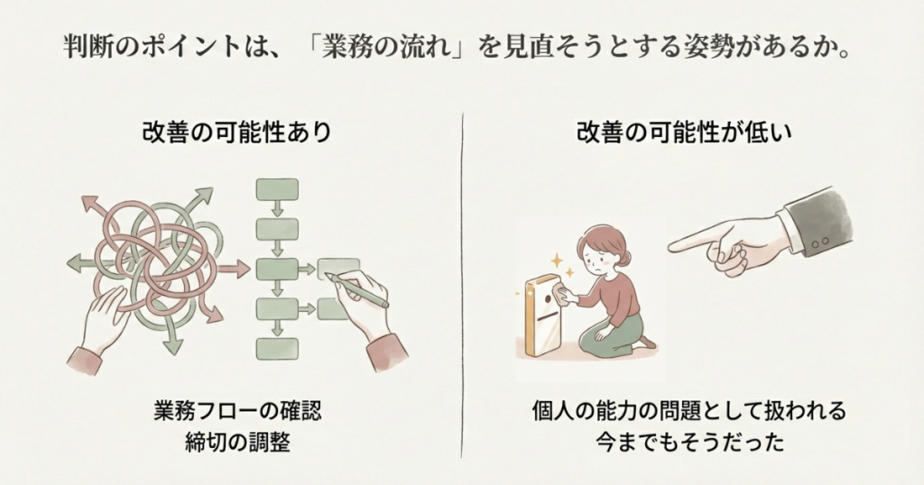改善が見込めるかどうかは、仕組みそのものを見直そうとする姿勢が職場側にあるかどうかで判断できます。
