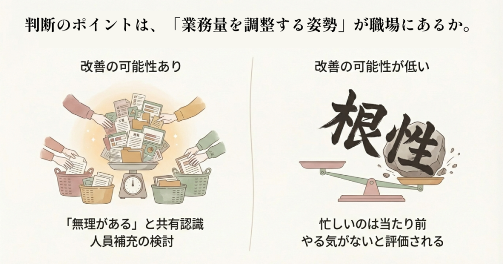 改善が見込めるかどうかは、業務量を調整しようとする姿勢が職場側にあるかどうかで判断します。