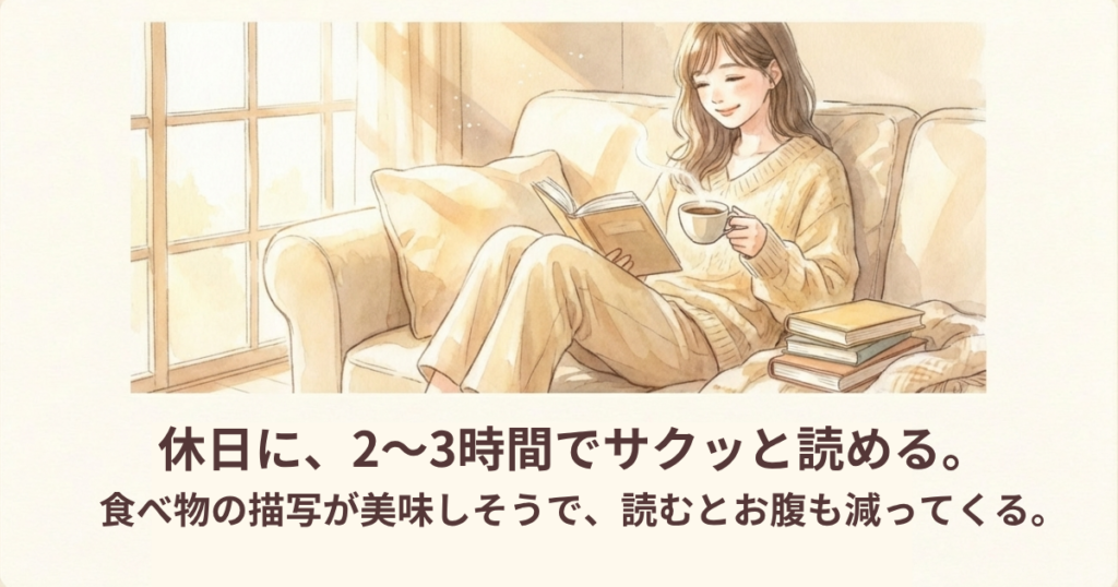 そして、食べ物の描写があまりにも美味しそうで、読み終える頃には「ちゃんとしたご飯を食べよう」という気持ちに。心は本で栄養補給、体も食事を取って栄養補給。「読書をする」というゆっくりした過ごし方のお陰で、疲れた心と体を回復することができました。巷で「ビタミン小説」と呼ばれるのは、このためかもしれません。
