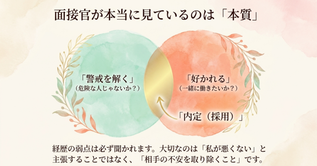 面接でやるべきことは「私は悪くない」と主張することではありません。「面接官の警戒を解くこと」と「好かれること」の2つを、同時にクリアする。その軸を忘れずに振る舞うことが大切です。