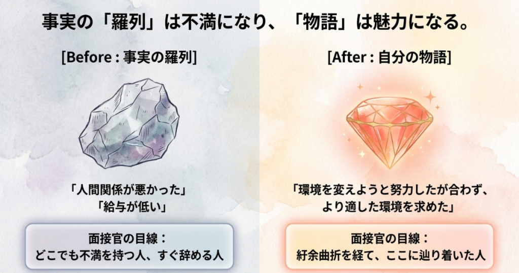これらがすべて事実だったとしても、聞いている面接官から見れば、「不満が多い人」「コミュニケーションが苦手な人」。そして、「嫌になればすぐ辞めてしまう人」として映ります。
