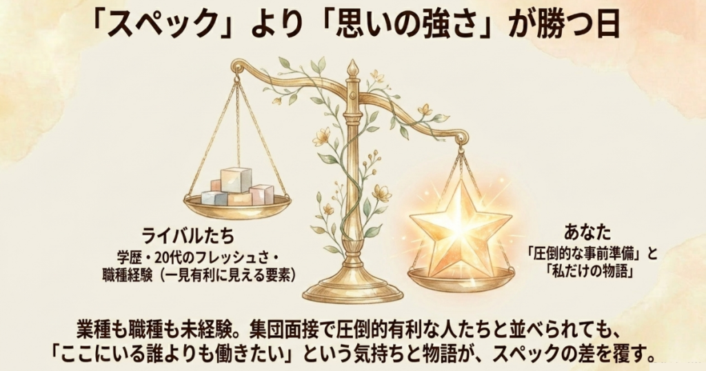 転職時には、年齢や所持資格、同職種での職歴有無が有利に働くことは否めません。ですが、事前準備と物語の伝え方次第では、「スペックで負けていた人」が採用されることもあります。