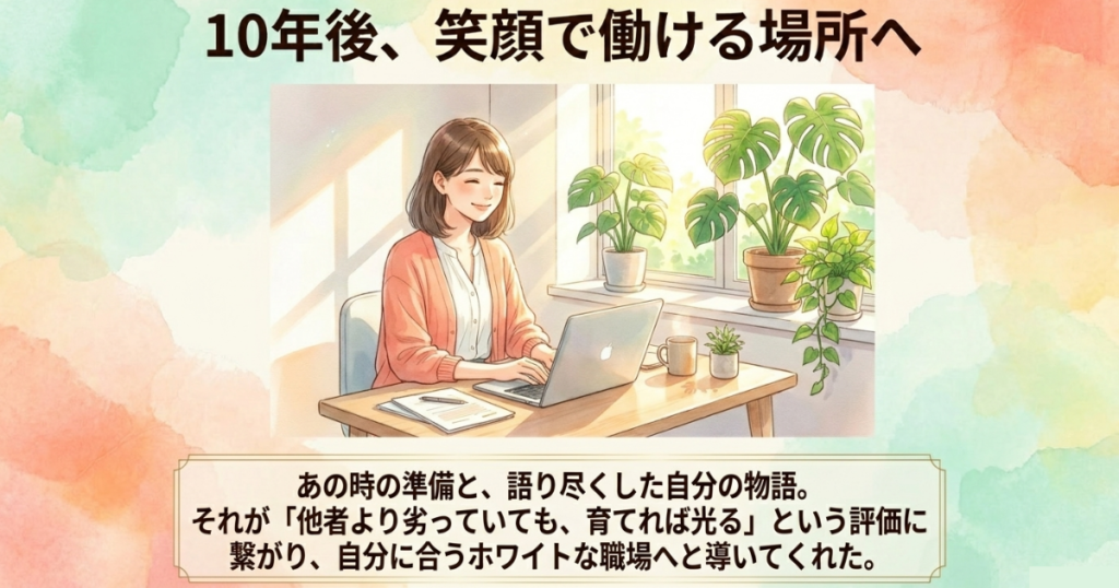 今思えば、あのとき採用してもらえたのは、おそらくワンチャン枠だったと思います。良く言えば、「今は他者より劣っているけど、育てれば光る」と言ったところでしょうか。あのとき気持ちを伝えきった結果、今も自分に合うホワイトな職場で10年以上働けています。