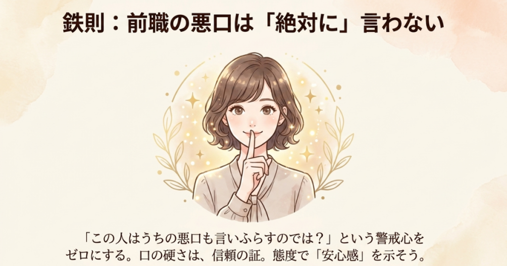 この物語を語る中で一つ、絶対に守るべきことがあります。前職の悪口は絶対に言わない。これは鉄則です。理由は単純で、「この人はうちの悪口も言いふらす可能性のある人物だ」と、警戒されるためです。前職の悪口を言わないことで、自分は口が硬い人間だと示し、面接官にとって好ましい人物像となります。