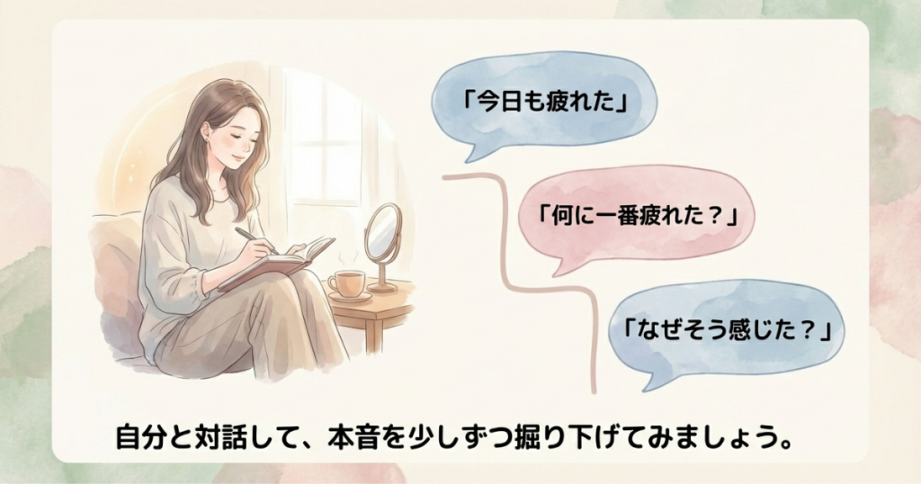 まずは、「今日も疲れたね。何が一番疲れた?」と自分に問いかけてみてください。自分の中から答えが出たら、そこからもう一段だけ掘り下げてみます。