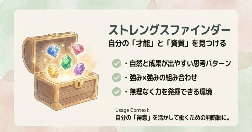 「何が向いていないか」を探すというより、自分の上位資質の組み合わせから、自然に成果が出やすい方向性を知るためのツールという位置づけになります。無理を重ねて頑張るのではなく、上位資質同士を活かせる環境に身を置くための判断軸として活用できます。