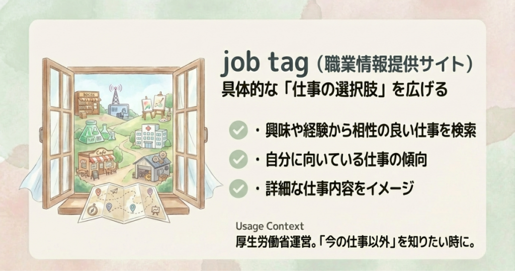 ジョブタグ(Job Tag)は、厚生労働省が運営する職業情報提供サイトです。無料で利用でき、興味やこれまでの経験をもとに、相性のよさそうな職業を提示してくれます