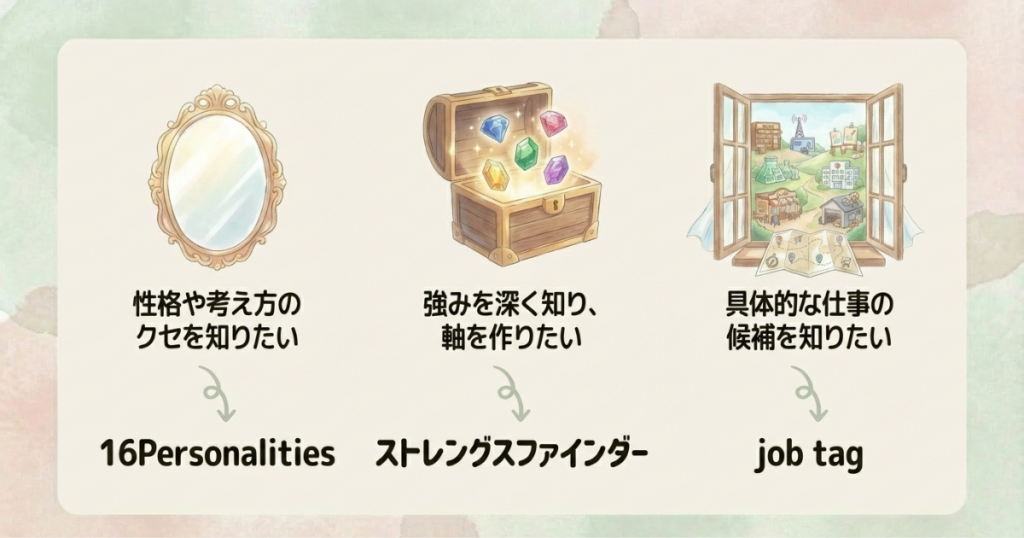「自己分析ツール」といっても、それぞれ役割が異なります。すべてをやる必要はなく、今の自分の状態に合いそうなものを、ひとつ試してみるだけでも十分です。