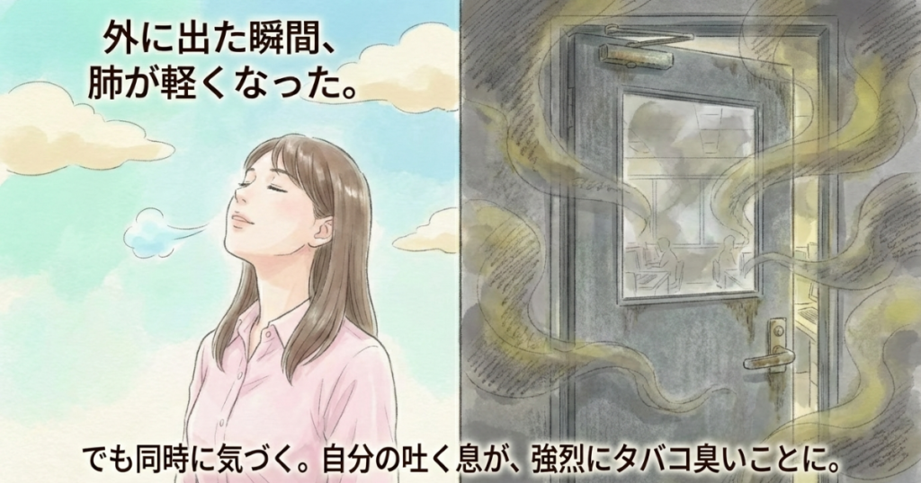 昼休憩後、銀行へ行く業務のため、前任者のBさんと外へ出ました。外の空気を吸った瞬間、肺の奥がふっと軽くなる感覚がありました。そして同時に、自分の吐いた息が強烈にタバコ臭いことに気づきます。髪も、スーツも、カバンも、すべてににおいが染みついていました。