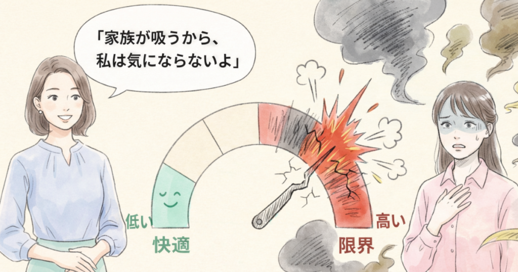 喫煙者や喫煙に慣れている人にとっての「問題ない」と、非喫煙者が感じる「問題ない」は、基準そのものが違うのだと、このとき気が付きました。この差は、個人の努力で埋められるものではありません。