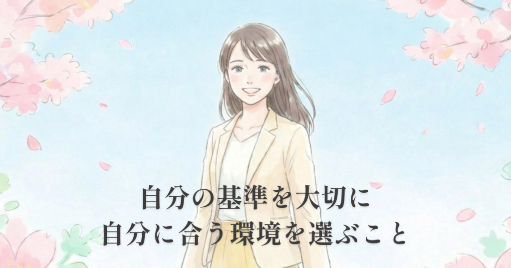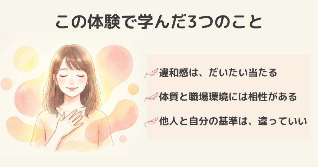 違和感を見過ごさなかったからこそ、私は今の職場に巡り合えました。あの一日は、遠回りではなく、自分の基準を知るための時間だったのだと思っています。職場環境と体質には相性があります。あなたの感じている「無理」は甘えではなく、あなたに合う環境に移動するための羅針盤かもしれません。