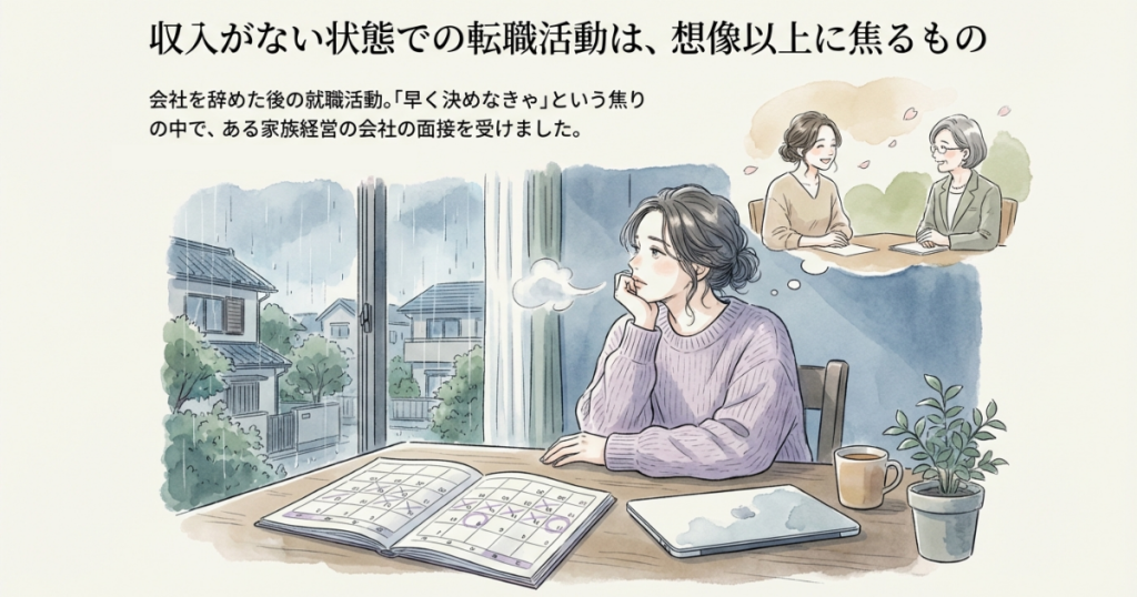 収入がないなかでの転職活動は、想像以上に焦るものです。会社を退職し、無職の状態で受けた面接でした。女性役員との面接は和やかに進み、話の中で家族経営の企業だと知りました。「採用なら3日以内に連絡で、不採用なら履歴書を返送しますね」と言われ、面接は終了。