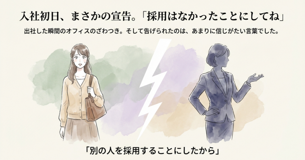 入社初日。会社へ向かい、入口で挨拶をした瞬間、事務所の空気がざわつきました。奥から出てきたのは、面接をしてくれた女性役員。そして、想像もしていなかった一言を告げられました。