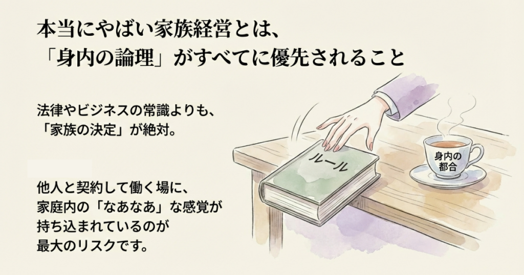 本当にやばい家族経営とは、身内の判断がルールよりも優先される会社のことだと私は思います。家族経営という形そのものが問題なのではありません。問題なのは、他人と契約で働く場に、家族内の感覚がそのまま持ち込まれていることです。採用という人生に直結する出来事さえ、身内の判断ひとつでひっくり返る。そのズレに、私は一番の怖さを感じました。そうした会社は、従業員の人生を平気で軽く扱います。