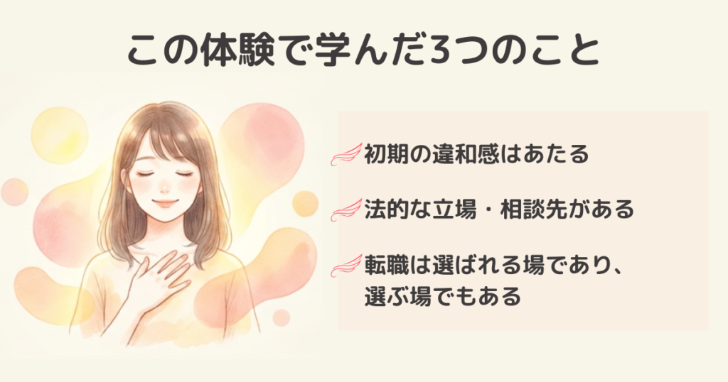 当時の私は何も知らず、悔しさを抱えて泣くことしかできませんでした。ですが、これらを知っていれば、きっと向き合い方は違っていたと思います。私のこの体験が、「納得できる職場選び」のきっかけになれば嬉しいです。