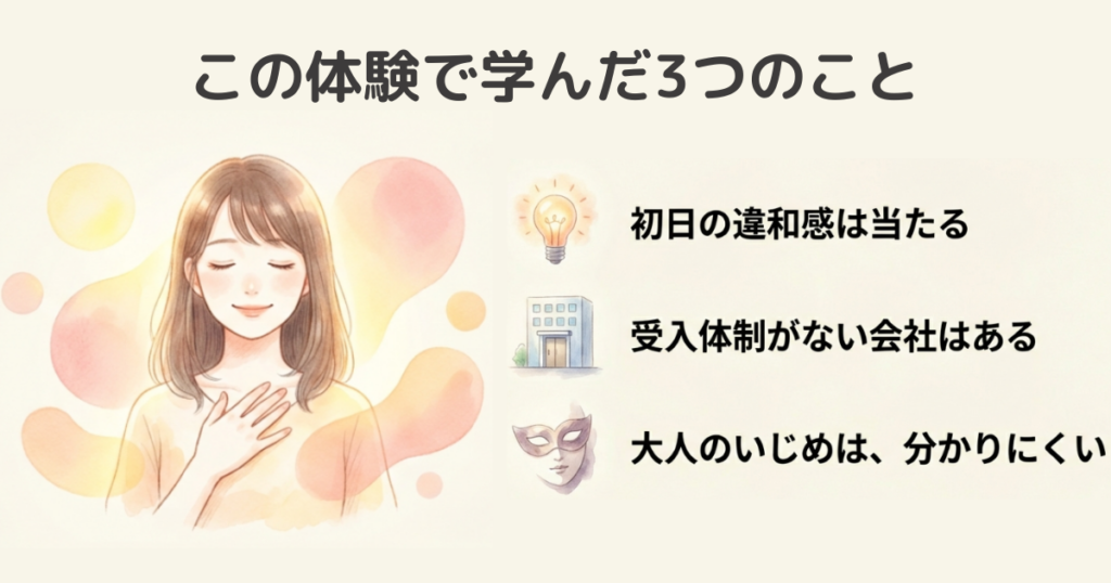 転職初日の出来事は、当時の私にとってかなりショックなものでした。ただ、時間が経って冷静に振り返ってみると、「安全に働けない職場に留まらないのは正解」だと、今は思っています。