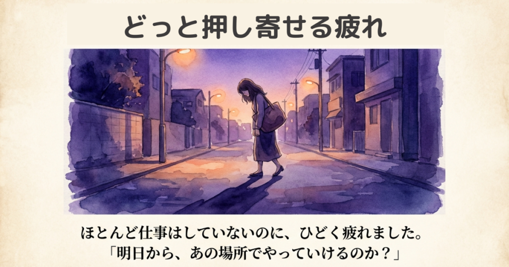 帰宅後、ひどく疲れていました。頭の中では、事務室の光景が何度もよみがえります。「あの会社で、これから働いていけるんだろうか?」Aさんが退職したあと、私はどう扱われるのか。入社初日から、これからのいじめを心配しなければならない職場。気持ちは、どんどん重くなっていきました。それでも、ようやく決まった再就職。自分から手放す決断は、簡単にはできません。